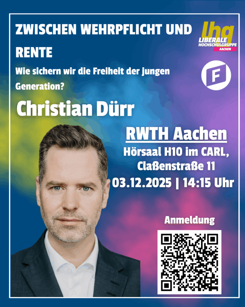 Am 03.12.2025 geht es um „Zwischen Wehrpflicht und Rente — Wie sichern wir die Freiheit der jungen Generation?“ mit dem Parteivorsitzenden Christian Dürr. Gerade jetzt, brauchen wir eine liberale Stimme, die unsere Freiheit verteidigt.